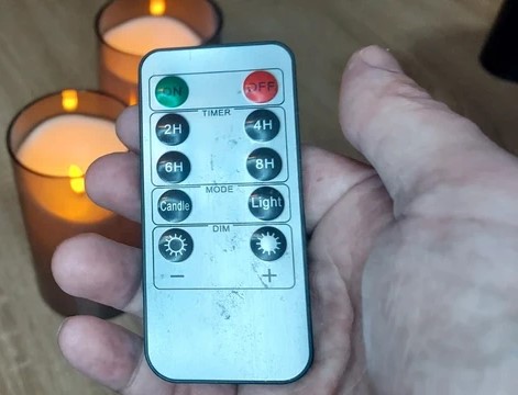 Drie grijze plastic kaarsen branden als echte kaarsen